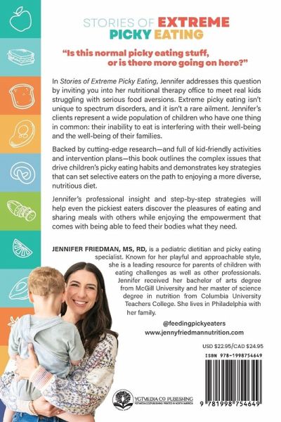 "Is this normal picky eating stuff, or is there more going on here?" In Stories of Extreme Picky Eating, Jennifer addresses this question by inviting you into her nutritional therapy office to meet real kids struggling with serious food aversions. Extreme picky eating isn't unique to spectrum disorders, and it isn't a rare ailment. Jennifer's clients make up a wide population of children who have one thing in common: their inability to eat is interfering with their well-being and the well-being of their families. Backed by cutting-edge research-and including kid-friendly activities and intervention plans-this book outlines the complex issues that drive children's picky eating habits and implements key strategies that can set them on the path to enjoying a more diverse, nutritious diet. Jennifer's professional insight and step-by-step strategies will help even the pickiest eaters discover the pleasures of eating and sharing meals with others while enjoying the empowerment that comes with being able to feed their bodies what they need. About the Author Jennifer Friedman, MS, RD, is a pediatric dietitian and picky eating specialist. Known for her playful and approachable style, she is a leading resource for parents of children with eating challenges as well as other professionals. Jennifer received her bachelor of arts degree from McGill University and her master of science degree in nutrition from Columbia University Teachers College. She lives in Philadelphia with her family.