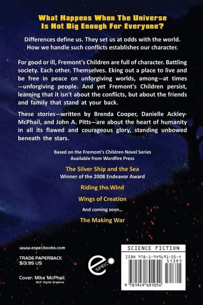 What Happens When The Universe Is Not Big Enough For Everyone? Differences define us. They set us at odds with the world. How we handle such conflicts establishes our character. For good or ill, Fremont’s Children are full of character. Battling society. Each other. Themselves. Eking out a place to live and be free in peace on unforgiving worlds, among—at times—unforgiving people. And yet Fremont’s Children persist, learning that it isn’t about the conflicts, but about the friends and family that stand at your back. These stories—written by Brenda Cooper, Danielle Ackley-McPhail, and J.A. Pitts—are about the heart of humanity in all its flawed and courageous glory, standing unbowed beneath the stars. Based on the Fremont’s Children Novel Series, Available from Wordfire Press The Silver Ship and the Sea Winner of the 2008 Endeavor Award Riding the Wind Wings of Creation And coming soon… The Making War