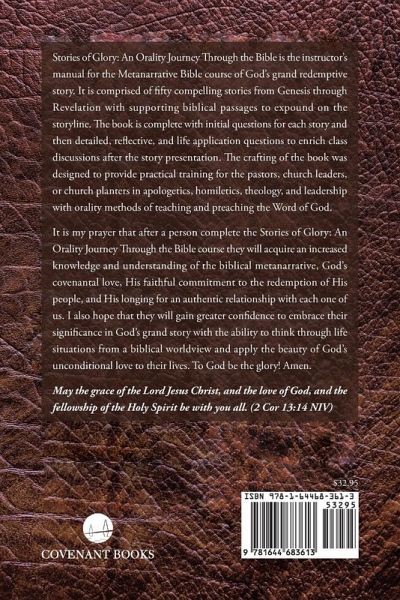 Stories of Glory: An Orality Journey Through the Bible is the instructor’s manual for the Metanarrative Bible course of God’s grand redemptive story. It is comprised of fifty compelling stories from Genesis through Revelation with supporting biblical passages to expound on the storyline. The book is complete with initial questions for each story and then detailed, reflective, and life application questions to enrich class discussions after the story presentation. The crafting of the book was designed to provide practical training for the pastors, church leaders, or church planters in apologetics, homiletics, theology, and leadership with orality methods of teaching and preaching the Word of God. It is my prayer that after a person complete the Stories of Glory: An Orality Journey Through the Bible course they will acquire an increased knowledge and understanding of the biblical metanarrative, God’s covenantal love, His faithful commitment to the redemption of His people, and His longing for an authentic relationship with each one of us. I also hope that they will gain greater confidence to embrace their significance in God’s grand story with the ability to think through life situations from a biblical worldview and apply the beauty of God’s unconditional love to their lives. To God be the glory! Amen. May the grace of the Lord Jesus Christ, and the love of God, and the fellowship of the Holy Spirit be with you all. (2 Cor 13:14 NIV)