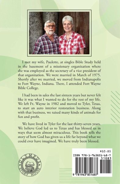 I met my wife, Paulette, at singles Bible Study held in the basement of a missionary organization where she was employed as the secretary of a vice president of that organization. We were married in March of 1975. Shortly after we married, we moved from Indianapolis to Fort Wayne, Indiana. There, I attended Fort Wayne Bible College. I had been in sales the last sixteen years but never felt like it was what I wanted to do for the rest of my life. We left Ft. Wayne in 1982 and moved to Tyler, Texas, to start an auto interior restoration business. Along with that business, we raised many kinds of animals for fun and profit. We have lived in Tyler for the last thirty-seven years. We believe God led us to Texas and has blessed us in ways that seem almost miraculous. This book tells the story of how God has given us a life far beyond what we could ever have imagined. We have truly been blessed.