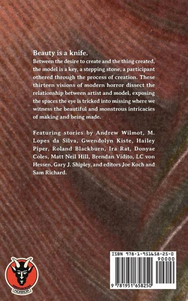 Beauty is a knife. Between the desire to create and the thing created, the model is a key, a stepping stone, a participant othered through the process of creation. These thirteen visions of modern horror dissect the relationship between artist and model, exposing the spaces the eye is tricked into missing where we witness the beautiful and monstrous intricacies of making and being made. Featuring stories by Andrew Wilmot, M. Lopes da Silva, Gwendolyn Kiste, Hailey Piper, Roland Blackburn, Ira Rat, Donyae Coles, Matt Neil Hill, Brendan Vidito, LC von Hessen, Gary J. Shipley, and editors Joe Koch and Sam Richard.