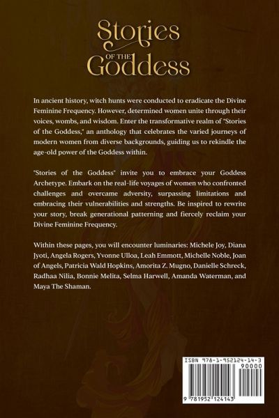 Enter the transformative realm of "Stories of the Goddess," an anthology that celebrates the varied journeys of modern women from diverse backgrounds, guiding us to rekindle the age-old power of the Goddess within. In ancient history, witch hunts were conducted to eradicate the Divine Feminine Frequency. However, determined women unite through their voices, wombs, and wisdom. Embark on the real-life voyages of women who confronted challenges and overcame adversity, surpassing limitations and embracing their vulnerabilities and strengths. Be inspired to rewrite your story, break generational patterning and fiercely reclaim your Divine Feminine Frequency. This book is a resounding call to trailblaze with self-empowerment and transformation. Within these pages, you will encounter luminaries: Michele Joy, Diana Jyoti, Angela Rogers, Yvonne Ulloa, Michelle Noble, Joan of Angels, Patricia Wald Hopkins, Leah Emmott, Amorita Z. Mugno, Danielle Schreck, Radhaa Nilia, Bonnie Melita, Selma Harwell, Amanda Waterman, and Maya The Shaman