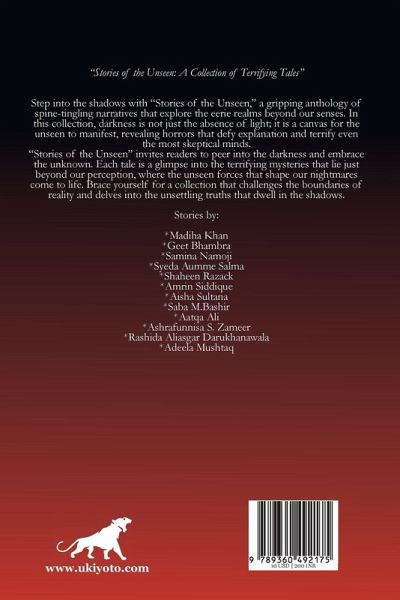 "Stories of the Unseen: A Collection of Terrifying Tales" Step into the shadows with "Stories of the Unseen," a gripping anthology of spine-tingling narratives that explore the eerie realms beyond our senses. In this collection, darkness is not just the absence of light; it is a canvas for the unseen to manifest, revealing horrors that defy explanation and terrify even the most skeptical minds. "Stories of the Unseen" invites readers to peer into the darkness and embrace the unknown. Each tale is a glimpse into the terrifying mysteries that lie just beyond our perception, where the unseen forces that shape our nightmares come to life. Brace yourself for a collection that challenges the boundaries of reality and delves into the unsettling truths that dwell in the shadows.