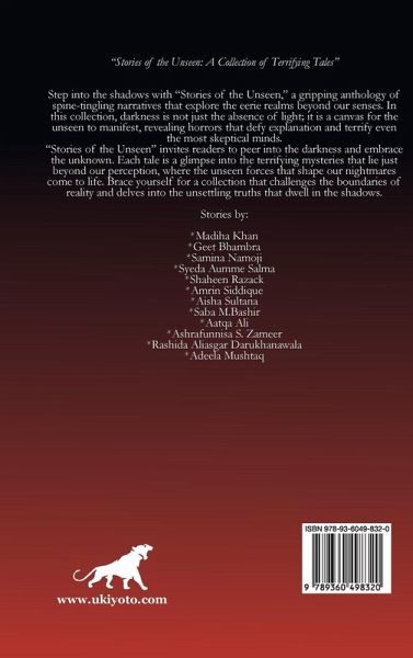 "Stories of the Unseen: A Collection of Terrifying Tales" Step into the shadows with "Stories of the Unseen," a gripping anthology of spine-tingling narratives that explore the eerie realms beyond our senses. In this collection, darkness is not just the absence of light; it is a canvas for the unseen to manifest, revealing horrors that defy explanation and terrify even the most skeptical minds. "Stories of the Unseen" invites readers to peer into the darkness and embrace the unknown. Each tale is a glimpse into the terrifying mysteries that lie just beyond our perception, where the unseen forces that shape our nightmares come to life. Brace yourself for a collection that challenges the boundaries of reality and delves into the unsettling truths that dwell in the shadows.