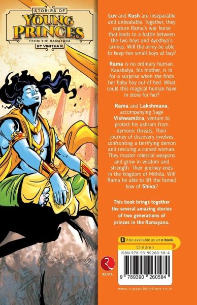 Luv and Kush are inseparable and unbeatable. Together, they capture Rama's war horse that leads to a battle between the two boys and Ayodhya's armies. Will the army be able to keep two small boys at bay? Rama is no ordinary human. Kaushalya, his mother, is in for a surprise when she finds her baby boy out of bed. What could this magical human have in store for her? Rama and Lakshmana, accompanying Sage Vishwamitra, venture to protect his ashram from demonic threats. Their journey of discovery involves confronting a terrifying demon and rescuing a cursed woman. They master celestial weapons and grow in wisdom and strength. Their journey ends in the kingdom of Mithila. Will Rama be able to lift the famed bow of Shiva? This book brings together the several amazing stories of two generations of princes in the Ramayana.