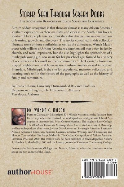 Stories Seen Through Screen Doors The Roots and Branches of Black Southern Experience A truth seldom recognized is that there are almost as many African American southern experiences as there are states and cities in the South. Our lives as southern black people intersect, but they also diverge into unique patterns of learning, growth, and discovery. The stories contained in this collection illustrate some of those similarities as well as the differences. Wanda Macon shares with millions of African Americans a southern soil that is rich in family, church, and racial repression, but she also highlights the spiritedness of a tomboyish young girl, too smart for her preschool age, formed by a variety of occurrences in her small southern community. "The Courts," a horseshoe shaped neighborhood and home to twenty-three families located in fictional Friarsdale, Mississippi, is the site for experience, memory, reflection, and locating one's self in the history of the geography as well as the history of family and community. By Trudier Harris, University Distinguished Research Professor Department of English, The University of Alabama Tuscaloosa, Alabama