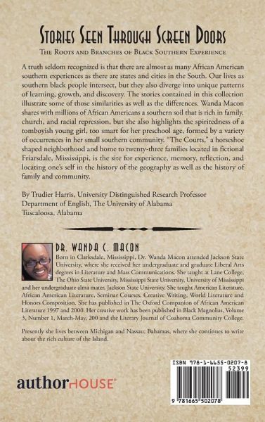 Stories Seen Through Screen Doors The Roots and Branches of Black Southern Experience A truth seldom recognized is that there are almost as many African American southern experiences as there are states and cities in the South. Our lives as southern black people intersect, but they also diverge into unique patterns of learning, growth, and discovery. The stories contained in this collection illustrate some of those similarities as well as the differences. Wanda Macon shares with millions of African Americans a southern soil that is rich in family, church, and racial repression, but she also highlights the spiritedness of a tomboyish young girl, too smart for her preschool age, formed by a variety of occurrences in her small southern community. "The Courts," a horseshoe shaped neighborhood and home to twenty-three families located in fictional Friarsdale, Mississippi, is the site for experience, memory, reflection, and locating one's self in the history of the geography as well as the history of family and community. By Trudier Harris, University Distinguished Research Professor Department of English, The University of Alabama Tuscaloosa, Alabama