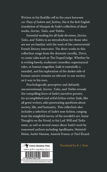 Written in his Bastille cell in the years between 120 Days of Sodom and Justine, this is the first English translation of Marquis de Sade's collection of short works, Stories, Tales, and Fables. Essential reading for all Sade devotees, Stories, Tales, and Fables is an introduction for those who are not yet familiar with the work of this controversial French literary innovator. The short works in this collection range from the dramatic novella, Dorci, to comic tales such as The Duped Judge. Whether he is writing bawdy, exuberant comedies, supernatural tales, or human tragedies, Sade is essentially a moralist, and his exploration of the darker side of human nature remains as relevant to our society as it was to his own. Psychologically perceptive and defiantly unconventional, Stories, Tales, and Fables reveals the compelling force of Sade's narrative powers. An accomplished and artful fiction writer, Sade, like all great writers, asks penetrating questions about society, life, and humanity. This collection also includes a selection of Sade's non-fiction, ranging from his insightful survey of the novelist's art, Some Thoughts on the Novel, to his Last Will and Testament, as well as several essays about Sade's work by renowned authors including Apollinaire, Heinrich Heine, André Masson, Anatole France, and Paul ¿luard.