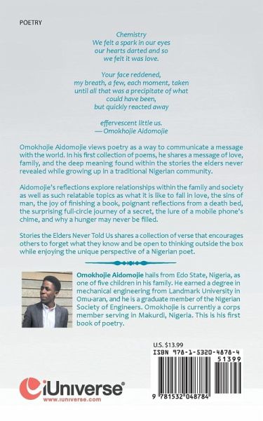 Chemistry We felt a spark in our eyes our hearts darted and so we felt it was love. Your face redeemed, my breath, a few, each moment, taken until all that was a precipitate of what could have been, but quickly reacted away effervescent little us. Omokhojie Aidomojie Omokhojie Aidomojie views poetry as a way to communicate a message with the world. In his first collection of poems, he shares a message of love, family, and the deep meaning found within the stories the elders never revealed while growing up in a traditional Nigerian community. Aidomojies reflections explore relationships within the family and society as well as such relatable topics as what it is like to fall in love, the sins of man, the joy of finishing a book, poignant reflections from a death bed, the surprising full-circle journey of a secret, the lure of a mobile phones chime, and why a hunger may never be filled. Stories the Elders Never Told Us shares a collection of verse that encourages others to forget what they know and be open to thinking outside the box while enjoying the unique perspective of a Nigerian poet.