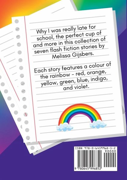 Why I was really late for school, the perfect cup of tea, and more in this collection of seven flash fiction stories by Melissa Gijsbers. Each story features a colour of the rainbow - red, orange, yellow, green, blue, indigo, and violet. This collection includes seven writing prompts at the end that were used to inspire the stories in the collection.