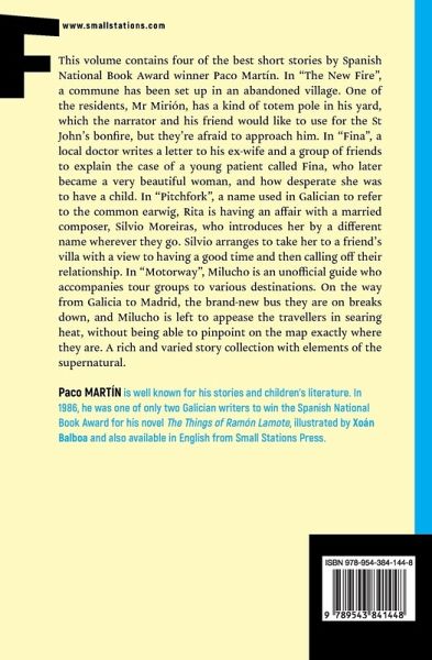This volume contains four of the best short stories by Spanish National Book Award winner Paco Martín. In "The New Fire", a commune has been set up in an abandoned village. One of the residents, Mr Mirión, has a kind of totem pole in his yard, which the narrator and his friend would like to use for the St John's bonfire, but they're afraid to approach him. In "Fina", a local doctor writes a letter to his ex-wife and a group of friends to explain the case of a young patient called Fina, who later became a very beautiful woman, and how desperate she was to have a child. In "Pitchfork", a name used in Galician to refer to the common earwig, Rita is having an affair with a married composer, Silvio Moreiras, who introduces her by a different name wherever they go. Silvio arranges to take her to a friend's villa with a view to having a good time and then calling off their relationship. In "Motorway", Milucho is an unofficial guide who accompanies tour groups to various destinations. On the way from Galicia to Madrid, the brand-new bus they are on breaks down, and Milucho is left to appease the travellers in searing heat, without being able to pinpoint on the map exactly where they are. A rich and varied story collection with elements of the supernatural. Paco Martín is well known for his stories and children's literature. In 1986, he was one of only two Galician writers to win the Spanish National Book Award for his novel The Things of Ramón Lamote, illustrated by Xoán Balboa and also available in English from Small Stations Press.