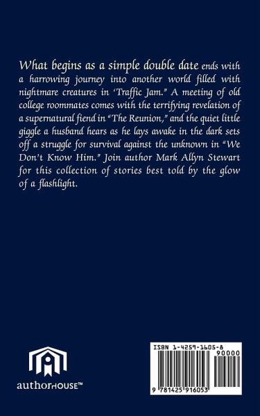 What begins as a simple double date ends with a harrowing journey into another world filled with nightmare creatures in 'Traffic Jam." A meeting of old college roommates comes with the terrifying revelation of a supernatural fiend in "The Reunion," and the quiet little giggle a husband hears as he lays awake in the dark sets off a struggle for survival against the unknown in "We Don't Know Him." Join author Mark Allyn Stewart for this collection of stories best told by the glow of a flashlight.