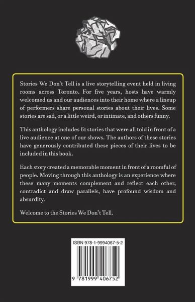 Stories We Don’t Tell is a live storytelling event held in living rooms across Toronto. For five years, hosts have warmly welcomed us and our audiences into their home where a lineup of performers share personal stories about their lives. Some stories are sad, or a little weird, or intimate, and others funny. This anthology includes 61 stories that were all told in front of a live audience at one of our shows. The authors of these stories have generously contributed these pieces of their lives to be included in this book. Each story created a memorable moment in front of a roomful of people. Moving through this anthology is an experience where these many moments complement and reflect each other, contradict and draw parallels, have profound wisdom and absurdity. Welcome to the Stories We Don’t Tell.