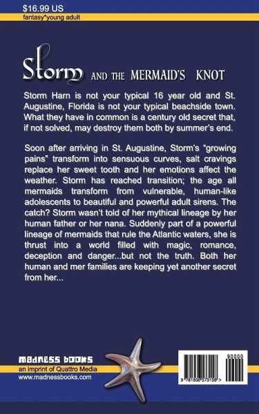 Storm Harn is not your typical 16 year old and St Augustine, Florida is not your typical beachside town. What they have in common is a century old secret that, if not solved, may destroy them both by summer's end. Soon after arriving in St. Augustine, Storm's "growing pains" transform into sensuous curves, salt cravings replace her sweet tooth and her emotions affect the weather. Storm has reached transition; the age all mermaids transform from vulnerable, human-like adolescents to beautiful and powerful adult sirens. The catch? Storm wasn't told of her mythical lineage by her human father or her nana. Suddenly part of a powerful lineage of mermaids that rule the Atlantic waters, she is thrust into a world filled with magic, romance, deception and danger...but not the truth. Both her human and mer families are keeping yet another secret from her...