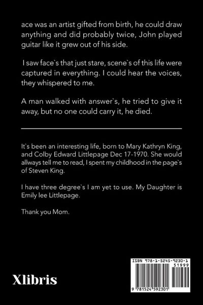Ace was an artist gifted from birth. He could draw anything and did probably twice, and John played guitar like it grew out of his side. I saw faces that just stare. Scenes of this life were captured in everything. I could hear the voices. They whispered to me. A man walked with answers, and he tried to give it away. But no one could carry it, and he died.