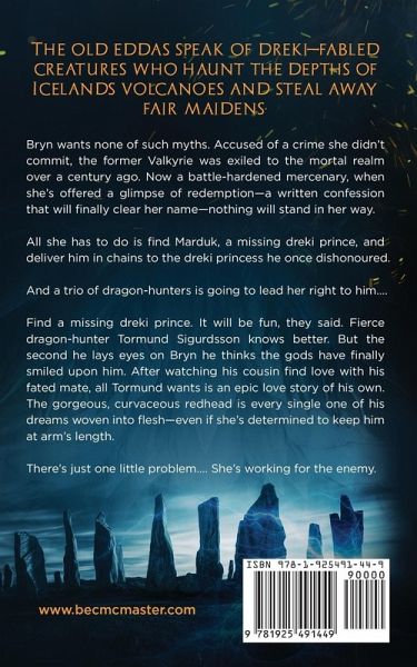 The old eddas speak of dreki-fabled creatures who haunt the depths of Iceland's volcanoes and steal away fair maidens. Bryn wants none of such myths. Accused of a crime she didn't commit, the former Valkyrie was exiled to the mortal realm over a century ago. Now a battle-hardened mercenary, when she's offered a glimpse of redemption-a written confession that will finally clear her name-nothing will stand in her way. All she has to do is find Marduk, a missing dreki prince, and deliver him in chains to the dreki princess he once dishonoured. And a trio of dragon-hunters is going to lead her right to him.... Find a missing dreki prince. It will be fun, they said. Fierce dragon-hunter Tormund Sigurdsson knows better. But the second he lays eyes on Bryn he thinks the gods have finally smiled upon him. After watching his cousin find love with his fated mate, all Tormund wants is an epic love story of his own. The gorgeous, curvaceous redhead is every single one of his dreams woven into flesh-even if she's determined to keep him at arm's length. There's just one little problem.... She's working for the enemy. ¿Join USA Today bestselling author, Bec McMaster, on a thrilling quest, with a handsome charmer determined to seduce an ice queen, and a dangerous magic that may destroy the world if unleashed. Download this epic fantasy filled with magic and breathtaking romance today!