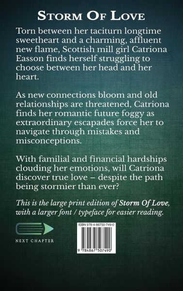Torn between her taciturn longtime sweetheart and a charming, affluent new flame, Scottish mill girl Catriona Easson finds herself struggling to choose between her head and her heart. As new connections bloom and old relationships are threatened, Catriona finds her romantic future foggy as extraordinary escapades force her to navigate through mistakes and misconceptions. With familial and financial hardships clouding her emotions, will Catriona discover true love - despite the path being stormier than ever? This is the large print edition of Storm Of Love, with a larger font / typeface for easier reading.¿