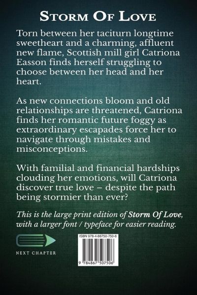 Torn between her taciturn longtime sweetheart and a charming, affluent new flame, Scottish mill girl Catriona Easson finds herself struggling to choose between her head and her heart. As new connections bloom and old relationships are threatened, Catriona finds her romantic future foggy as extraordinary escapades force her to navigate through mistakes and misconceptions. With familial and financial hardships clouding her emotions, will Catriona discover true love - despite the path being stormier than ever? This is the large print edition of Storm Of Love, with a larger font / typeface for easier reading.¿