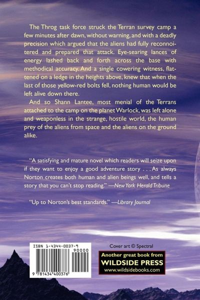The Throg task force struck the Terran survey camp a few minutes after dawn, without warning, and with a deadly precision which argued that the aliens had fully reconnoitered and prepared that attack. Eye-searing lances of energy lashed back and forth across the base with methodical accuracy. And a single cowering witness, flattened on a ledge in the heights above, knew that when the last of those yellow-red bolts fell, nothing human would be left alive down there. And so Shann Lantee, most menial of the Terrans attached to the camp on the planet Warlock, was left alone and weaponless in the strange, hostile world, the human prey of the aliens from space and the aliens on the ground alike. "A satisfying and mature novel which readers will seize upon if they want to enjoy a good adventure story... As always Norton creates both human and alien beings well, and tells a story that you can't stop reading."--New York Herald Tribune "Up to Norton's best standards." -- Library Journal