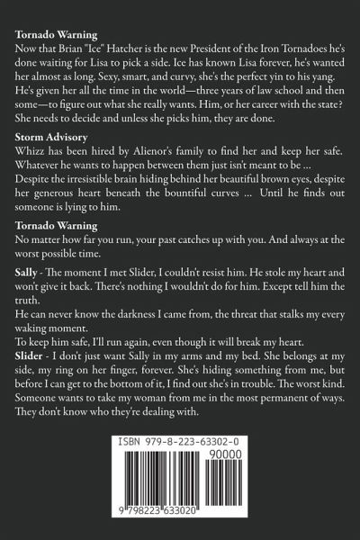 Tornado Warning Now that Brian "Ice" Hatcher is the new President of the Iron Tornadoes he's done waiting for Lisa to pick a side. Ice has known Lisa forever, he's wanted her almost as long. Sexy, smart, and curvy, she's the perfect yin to his yang. He's given her all the time in the world-three years of law school and then some-to figure out what she really wants. Him, or her career with the state? She needs to decide and unless she picks him, they are done. But Lisa doesn't want to chose. She wants its all: the man and the career. Can she pull it off or will she lose it all? Storm Advisory Whizz has been hired by Alienor's family to find her and keep her safe. Whatever he wants to happen between them just isn't meant to be … Despite the irresistible brain hiding behind her beautiful brown eyes, despite her generous heart beneath the bountiful curves … Until he finds out someone is lying to him. Tornado Warning No matter how far you run, your past catches up with you. And always at the worst possible time. Sally - The moment I met Slider, I couldn't resist him. He stole my heart and won't give it back. There's nothing I wouldn't do for him. Except tell him the truth. He can never know the darkness I came from, the threat that stalks my every waking moment. To keep him safe, I'll run again, even though it will break my heart. Slider - I don't just want Sally in my arms and my bed. She belongs at my side, my ring on her finger, forever. She's hiding something from me, but before I can get to the bottom of it, I find out she's in trouble. The worst kind. Someone wants to take my woman from me in the most permanent of ways. They don't know who they're dealing with. I'll hand them hell on earth to keep my woman safe.