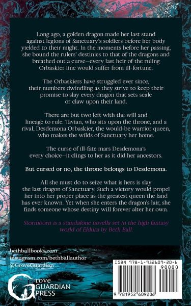 Long ago, a golden dragon made her last stand against legions of Sanctuary's soldiers before her body yielded to their might. In the moments before her passing, she bound the rulers' destinies to that of the dragons and breathed out a curse-every last heir of the ruling Orbaskier line would suffer from ill-fortune. The Orbaskiers have struggled ever since, their numbers dwindling as they strive to keep their promise to slay every dragon that sets scale or claw upon their land. There are but two left with the will and lineage to rule: Tavian, who sits upon the throne, and a rival, Desdemona Orbaskier, the would-be warrior queen, who makes the wilds of Sanctuary her home. The curse of ill-fate mars Desdemona's every choice-it clings to her as it did her ancestors. But cursed or no, the throne belongs to Desdemona. All she must do to seize what is hers is slay the last dragon of Sanctuary. Such a victory would propel her into her proper place as the greatest queen the land has ever known. Yet when she enters the dragon's lair, she finds someone whose destiny will forever alter her own. Stormborn is a standalone novella set in the high fantasy world of Eldura by Beth Ball.