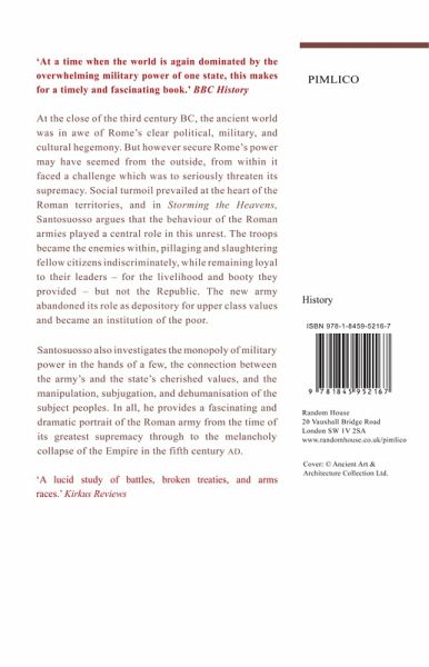 At the close of the third century B. C. the ancient world was in awe of Rome's clear political military and cultural hegemony. But however secure Rome's power may have seemed from the outside from within it faced a challenge which was to seriously to threaten its supremacy. Social turmoil prevailed at the heart of the Roman territories and in Storming the Heavens Santosuosso argues that the behaviour of the Roman armies played a central role in this unrest. The troops became the enemies within pillaging and slaughtering fellow citizens indiscriminately while remaining loyal to their leaders - for the livelihood and booty they provided - but not the Republic. The new army abandoned its role as depository for upper class values and became an institution of the poor. Santosuosso also investigates the monopoly of military power in the hands of a few the connection between the armies and the state's cherished values and the manipulation subjugation and dehumanisation of the subject peoples. In all he provides a fascinating and dramatic portrait of the Roman army from the time of its greatest supremacy through to the melancholy collapse of Empire in the fifth century A. D.