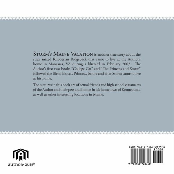 Storm's Maine Vacation is another true story about the stray mixed Rhodesian Ridgeback that came to live at the Author's home in Manassas, VA during a blizzard in February 2003. The Author's first two books "College Cat" and "The Princess and Storm" followed the life of his cat, Princess, before and after Storm came to live at his home. The pictures in this book are of actual friends and high school classmates of the Author and their pets and homes in his hometown of Kennebunk, as well as other interesting locations in Maine.