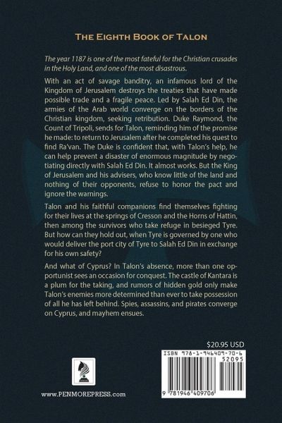 The year 1187 is one of the most fateful for the Christian crusades in the Holy Land, and one of the most disastrous. With an act of savage banditry, an infamous lord of the Kingdom of Jerusalem destroys the treaties that have made possible trade and a fragile peace. Led by Salah Ed Din, the armies of the Arab world converge on the borders of the Christian kingdom, seeking retribution. Duke Raymond, the Count of Tripoli, sends for Talon, reminding him of the promise he made: to return to Jerusalem after he completed his quest to find Ra’van. The Duke is confident that, with Talon’s help, he can help prevent a disaster of enormous magnitude by negotiating directly with Salah Ed Din. It almost works. But the King of Jerusalem and his advisers, who know little of the land and nothing of their opponents, refuse to honor the pact and ignore the warnings. Talon and his faithful companions finds themselves fighting for their lives at the springs of Cresson and the Horns of Hattin, then among the survivors who take refuge in besieged Tyre. But how can they hold out, when Tyre is governed by one who would deliver the port city of Tyre to Salah Ed Din in exchange for his own safety? And what of Cyprus? In Talon’s absence, more than one opportunist sees an occasion for conquest. The castle of Kantara is a plum for the taking, and rumors of hidden gold only make Talon’s enemies more determined than ever to take possession of all he has left behind. Spies, assassins, and pirates converge on Cyprus, and mayhem ensues.