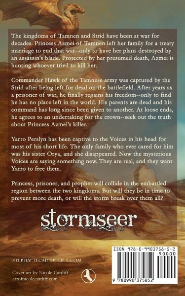The kingdoms of Tamnen and Strid have been at war for decades. Princess Azmei of Tamnen left her family for a treaty marriage to end that war–but an assassin’s blade destroyed her plans. Protected by her presumed death, Azmei hunts the person trying to destroy her family. Commander Hawk of the Tamnese army was captured by the Strid after being left for dead on the battlefield. After years as a prisoner of war, he is finally ransomed–only to find he has no place left in the world. His parents are dead and his command has long since been given to another. At loose ends, he agrees to an undertaking for the crown–seek out the truth about Princess Azmei’s killer. Yarro Perslyn has been captive to the Voices in his head for most of his short life. The only family who ever cared for him was his sister Orya, and she disappeared. Now the mysterious Voices in his head are saying something new. They are real, and they want Yarro to free them. Princess, prisoner, and prophet collide in the embattled region between the two kingdoms. But will they be in time to prevent more death, or will the rising storm break them all?