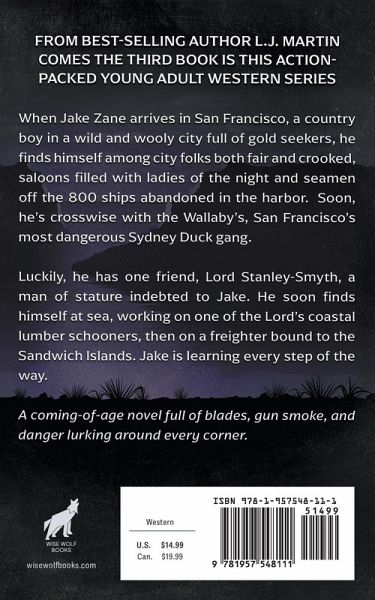 From best-selling author L.J. Martin comes the third book is this action-packed young adult western series. When Jake Zane arrives in San Francisco, a country boy in a wild and wooly city full of gold seekers, he finds himself among city folks both fair and crooked, saloons filled with ladies of the night and seamen off the 800 ships abandoned in the harbor. Soon, he's crosswise with the Wallaby's, San Francisco's most dangerous Sydney Duck gang. Luckily, he has one friend, Lord Stanley-Smyth, a man of stature indebted to Jake. He soon finds himself at sea, working on one of the Lord's coastal lumber schooners, then on a freighter bound to the Sandwich Islands. Jake is learning every step of the way. A coming-of-age novel full of blades, gun smoke, and danger lurking around every corner.