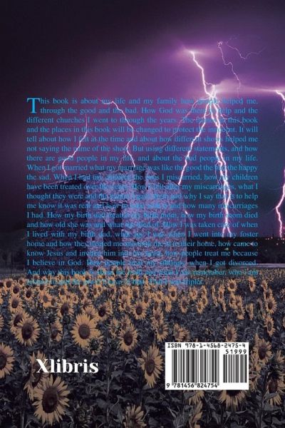 This book is about my life and my family how people helped me, through the good and the bad. how god was there to help and the diffrent churches i went to through the years. the names in this book and the places in this book will be changed to protect the innocent. it will tell about how i felt at the time and about how diffrent shows helped me not saying the name of the show. but using diffrent statements, and how there are good people in my life, and about the bad people in my life. when i got married what my marrage was like the good the bad the happy the sad. when i had my childern the ones i miscarried, how my childern have been treated over the years. how i felt after my miscarriages, what i thought they were and the names i gave them and why i say that is to help me know it was real and how to cope with it and how many miscarriages i had. how my birth dad treated my birth mom, how my birth mom died and how old she was and what she died of. how i was taken care of when i lived with my birth dad, what age i was when i went into my foster home and how they treated me and took me in to their home, how came to know jesus and invited him into my heart,how people treat me because i beleive in god. how people treat my sibbling's, when i got divorced. and why this book is about the truth and what i can remember, who i am related to and the proof i have of that. that i was a triplet.