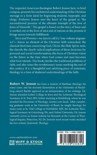 The respected American theologian Robert Jenson here, in brief compass, presents his uncluttered understanding of the Christian message in a form ideal for beginning students, laypeople, and clergy. Professor Jenson sees the heart of the gospel as ""the unconditional promise of the ultimate triumph of the love of Jesus of Nazareth."" This gospel is based on the story of Jesus and is worked out in the lives of men and of nations as the promise it brings moves towards fulfillment. Story and Promise--we dare to call it a ""one-volume dogmatics""--leaves no element of the Christian faith untouched: the classical doctrines concerning God, Christ, the Holy Spirit, man, the church; the clearly radical implications of these doctrines for personal and social transformation; the focus of Christian vision on the future as the time when God comes and man becomes what God intends. This book clarifies the traditional problems of faith, and also raises the revolutionary issues marking the end of this century. It is a thoughtful and satisfying piece of systematic theology in a time of shattered understandings of the faith.