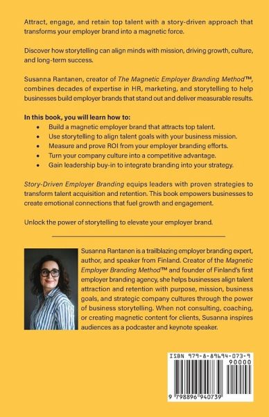 Story-Driven Employer Branding: Introducing The Magnetic Employer Branding Method(TM) Matching Minds with Mission Through Business Storytelling by Susanna Rantanen Struggling to stand out in today's fierce talent market? Tired of employer branding tactics that fall flat with leadership-and talent? This bold, transformative guide is your answer. Story-Driven Employer Branding introduces a proven, narrative-based methodology that turns employer branding into a strategic business advantage. Created by globally recognised employer branding expert Susanna Rantanen, this book reveals how to craft an emotionally resonant, talent-centric brand that speaks the language of today's professionals-and tomorrow's leaders. In this engaging, straight-talking book, you'll learn how to: * Build a Magnetic Employer Brand that attracts talent aligned with your culture, mission, and goals * Master the art of business storytelling to cut through the noise and spark deep emotional connections * Position talent as the hero of your brand and your company as their trusted guide * Measure employer branding ROI to finally earn the trust-and investment-of your C-suite * Transform your employer brand into a lever for growth, retention, and long-term competitive advantage Whether in HR, marketing, communications, or the C-suite, this book will shift your mindset from random acts of employer marketing to a clear, repeatable framework for sustainable talent magnetism. If you're ready to ditch boring campaigns and build a brand that attracts, inspires, and performs, this is the guidebook you've been waiting for. Perfect for fans of business storytelling, strategic culture, EVP transformation, and employee advocacy, this is the ultimate resource for anyone serious about employer branding in the modern world of work.