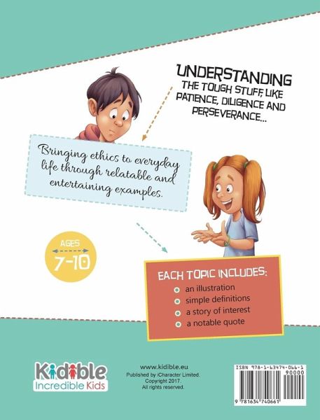 Bringing ethics to everyday life through relatable and entertaining examples. When we talk about Character, it means the values inside that determine our actions on the outside. Character is the model we use for making decisions. It’s like a moral compass that guides what we do. It’s who we are when no one else is watching. Suggested for ages 7 to 10. Why this book? What is good character? What are values? How do they work? Why are they important? Sooooo many questions, I know. But asking questions is a great way to find answers. Some folks you could ask these questions to are: Dad, Mom, relatives or your teacher. Reading a book is another great way to find answers. That’s probably why you’re reading this book today. Good move! For more great products, visit our website at www.kidible.eu