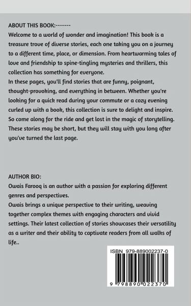 Owais Farooq's latest collection of stories is a mesmerizing journey through a diverse range of genres, characters, and settings. From heart-warming tales of love and friendship to dark and gripping stories of suspense and intrigue, each story in this book is crafted with precision and attention to detail. Farooq's ability to capture the essence of each character and setting is unparalleled, transporting readers to different worlds and immersing them in unforgettable stories. Whether you're a fan of romance, mystery, or science fiction, this book is sure to leave you captivated and craving for more.