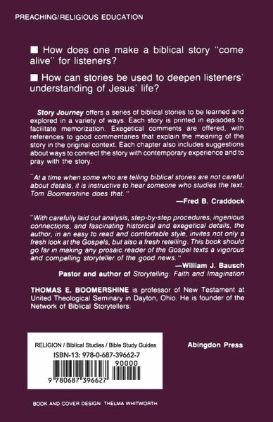 Story Journey offers a series of biblical stories to be learned and explored in a variety of ways. Each story is printed in episodes to facilitate memorization. Exegetical comments are offered, with references to good commentaries that explain the meaning of the story in the original context. Each chapter also includes suggestions about ways to connect the story with contemporary experience and to pray with the story Boomershine's chapters describe the essence of story as intertwining truth. Boomershine distinguishes learning a story in solitude from learning it with a friend or relating the story to another person altogether. Besides moral instruction, Boomershine examines roles stories have in pastoral care, peacemaking/arbitration scenarios.