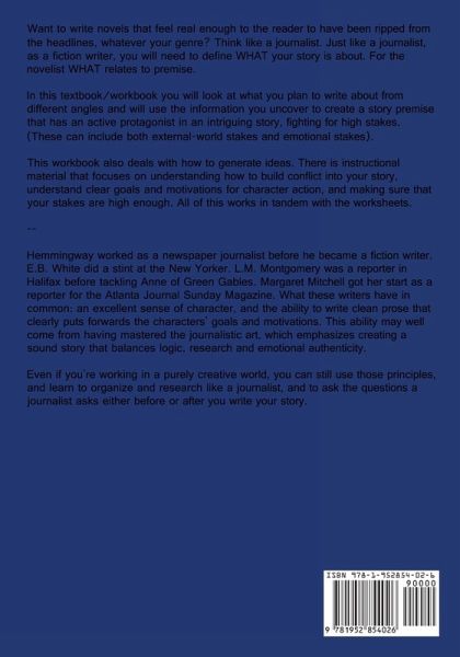 Want to write novels that feel real enough to the reader to have been ripped from the headlines, whatever your genre? Think like a journalist. Just like a journalist, as a fiction writer, you will need to define WHAT your story is about. For the novelist WHAT relates to premise. Get ready to explore the concept of premise. Those people in your head, desperate to be part of a story? They need something to do. It's the all-important WHAT that your story is about. To stay on track, you need a keystone to hold onto, so you don't get lost in all the things your story COULD be. Premise is your keystone, and it works like the legend for a road map. In this textbook/workbook you will look at what you plan to write about from different angles and will use the information you uncover to create a story premise that has an active protagonist in an intriguing story, fighting for high stakes. (These can include both external stakes and emotional stakes). This workbook serves as a full self-paced writing course, presenting theory on writing an effective premise - and then offering step-by-step worksheets that allow you to apply what you just learned to your own story. The instructional material is designed to give you a basic foundation in creative writing theory regarding clearly defining your story's concept, conflicts and plot question to create fiction with meaning using the information you add into the worksheets. Working through the entire WHAT Relates to Premiseb workbook will give you a sound thesis statement for the concepts and themes your novel will explore, and define other parameters you can pull from while writing. In short, you get a reference source for your world - and the expertise on how to use it. Approach refining premise the same way a journalist approaches a news story. Delve into understanding how to build a powerful premise and how to make sure your story is sound and will add up to something in which your specific characters overcome one specific problem or person in order to become a better or worse person. Instructional material focuses on building genuine conflict into your story, understanding clear goals and motivations for character action, and making sure that your stakes are high enough. All of this works in tandem with the worksheets. Write out your premise to define the heart of what your story is about, and what is at stake in it. Determine what you want to write about, and consider why. Boil that down into a concept. Uncover literary devices that you could use to support your premise. NOTE: The e-book version of this workbook links to printable versions of the worksheets. The page count is therefore different than the print book. Hemmingway worked as a newspaper journalist before he became a fiction writer. E.B. White did a stint at the New Yorker. L.M. Montgomery was a reporter in Halifax before tackling Anne of Green Gables. Margaret Mitchell got her start as a reporter for the Atlanta Journal Sunday Magazine. What these writers have in common: an excellent sense of character, and the ability to write clean prose that clearly puts forwards the characters' goals and motivations. This ability may well come from having mastered the journalistic art, which emphasizes creating a sound story that balances logic, research and emotional authenticity. &