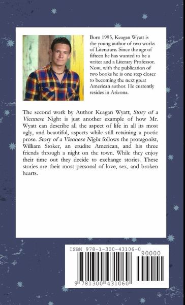 The second work by Author Keagan Wyatt, A Night in Vienna is just another example of how Mr. Wyatt can describe all the aspect of life in all its most ugly, and beautiful, aspects while still retaining a poetic prose. A Night in Vienna follows the protagonist, William Stoker, an erudite American, and his three friends through a night on the town. While they enjoy their time out they decide to exchange stories. These stories are their most personal of love, sex, and broken hearts.