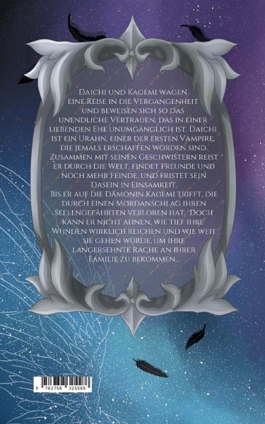 Daichi und Kagemi wagen eine Reise in die Vergangenheit und beweisen sich so das unendliche Vertrauen, das in einer liebenden Ehe unumgänglich ist. Daichi ist ein Urahn, einer der ersten Vampire, die jemals erschaffen worden sind. Zusammen mit seinen Geschwistern reist er durch die Welt, findet Freunde und noch mehr Feinde, und fristet sein Dasein in Einsamkeit.Bis er auf die Dämonin Kagemi trifft, die durch einen Mordanschlag ihren Seelengefährten verloren hat. Doch kann er nicht ahnen, wie tief ihre Wunden wirklich reichen und wie weit sie gehen würde, um ihre langersehnte Rache an ihrer Familie zu bekommen...