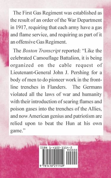 The First Gas Regiment was established as the result of an order of the War Department in 1917, requiring that each army have a gas and flame service, and requiring as part of it an offensive Gas Regiment. The Boston Transcript reported: "Like the celebrated Camouflage Battalion, it is being organized on the cable request of Lieutenant-General John J. Pershing for a body of men to do pioneer work in the front-line trenches in Flanders. The Germans violated all the laws of war and humanity with their introduction of searing flames and poison gases into the trenches of the Allies, and now American genius and patriotism are relied upon to beat the Hun at his own game."