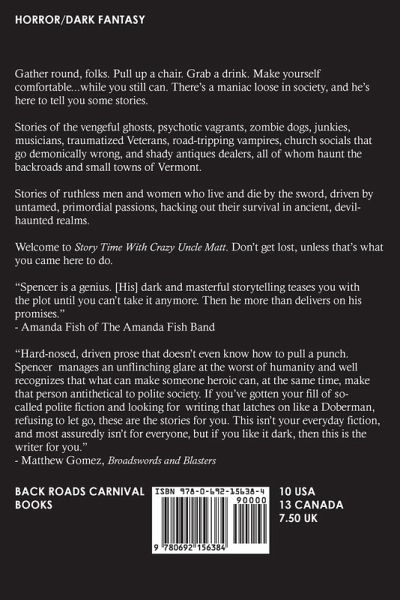 Gather round, folks. Pull up a chair. Grab a drink. Make yourself comfortable…while you still can. There’s a maniac loose in society, and he’s here to tell you some stories. Stories of the vengeful ghosts, psychotic vagrants, zombie dogs, junkies, musicians, traumatized Veterans, road-tripping vampires, church socials that go demonically wrong, and shady antiques dealers, all of whom haunt the backroads and small towns of Vermont. Stories of ruthless men and women who live and die by the sword, driven by untamed, primordial passions, hacking out their survival in ancient, devil-haunted realms. Welcome to Story Time With Crazy Uncle Matt. Don’t get lost, unless that’s what you came here to do.