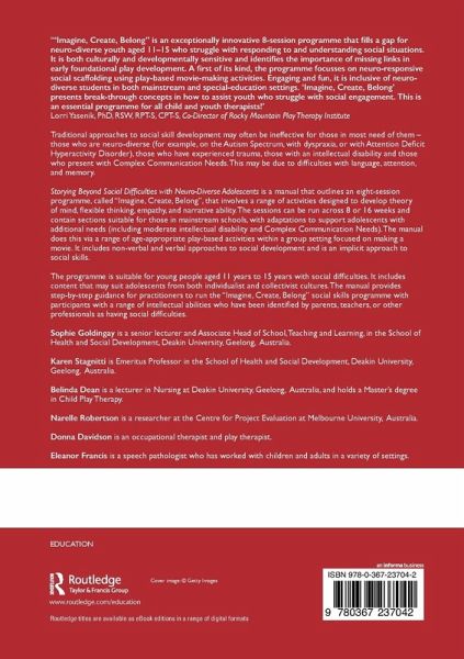 Traditional approaches to social skill development may often be ineffective for those in most need of them - those who are neuro-diverse (for example, on the Autism Spectrum, with dyspraxia, or with Attention Deficit Hyperactivity Disorder), those who have experienced trauma, those with an intellectual disability, and those who present with Complex Communication Needs. This may be due to difficulties with language, attention, and memory. Storying Beyond Social Difficulties with Neuro-Diverse Adolescents is a manual that outlines an eight-session programme, called "Imagine, Create, Belong", that involves a range of activities designed to develop theory of mind, flexible thinking, empathy, and narrative ability. The sessions can be run across 8 or 16 weeks and contain sections suitable for those in mainstream schools, with adaptations to support adolescents with additional needs (including moderate intellectual disability and Complex Communication Needs). The manual does this via a range of age-appropriate play-based activities within a group setting focused on making a movie. It includes non-verbal and verbal approaches to social development and is an implicit approach to social skills. The programme is suitable for young people aged 11 years to 15 years with social difficulties. It includes content that may suit adolescents from both individualist and collectivist cultures. The manual provides step-by-step guidance for practitioners to run the "Imagine, Create, Belong" social skills programme with participants with a range of intellectual abilities who have been identified by parents, teachers, or other professionals as having social difficulties.