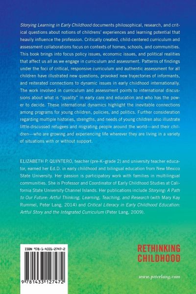 Storying Learning in Early Childhood documents philosophical, research, and critical questions about notions of childrens' experiences and learning potential that heavily influence the profession. Critically created, child-centered curriculum and assessment collaborations focus on contexts of homes, schools, and communities. This book brings into focus policy issues, economic issues, and political realities that affect us all as we engage in curriculum and assessment. Patterns of findings under the foci of critical, responsive curriculum and authentic assessment for all children have illustrated new questions, provoked new trajectories of informants, and reiterated connections to dynamic issues in early childhood internationally. The work involved in curriculum and assessment points to international discussions about what is «quality» in early care and education and who has the power to decide. These international dynamics highlight the inevitable connections among programs for young children, policies, and politics. Further consideration regarding multiple histories, strengths, and needs of young children also illustrate little-discussed refugees and migrating people around the world - and their children - who are growing and experiencing life wherever they are living in a variety of situations with or without support.