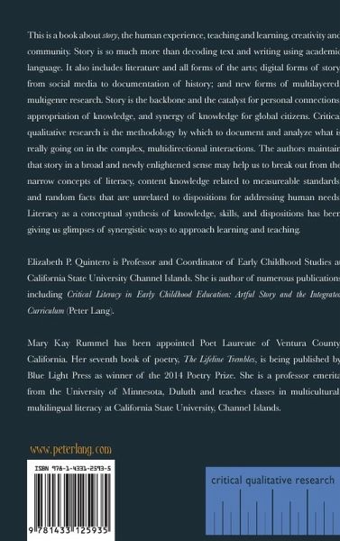 This is a book about story, the human experience, teaching and learning, creativity and community. Story is so much more than decoding text and writing using academic language. It also includes literature and all forms of the arts; digital forms of story, from social media to documentation of history; and new forms of multilayered, multigenre research. Story is the backbone and the catalyst for personal connections, appropriation of knowledge, and synergy of knowledge for global citizens. Critical qualitative research is the methodology by which to document and analyze what is really going on in the complex, multidirectional interactions. The authors maintain that story in a broad and newly enlightened sense may help us to break out from the narrow concepts of literacy, content knowledge related to measureable standards, and random facts that are unrelated to dispositions for addressing human needs. Literacy as a conceptual synthesis of knowledge, skills, and dispositions has been giving us glimpses of synergistic ways to approach learning and teaching.