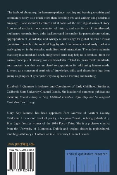 This is a book about story, the human experience, teaching and learning, creativity and community. Story is so much more than decoding text and writing using academic language. It also includes literature and all forms of the arts; digital forms of story, from social media to documentation of history; and new forms of multilayered, multigenre research. Story is the backbone and the catalyst for personal connections, appropriation of knowledge, and synergy of knowledge for global citizens. Critical qualitative research is the methodology by which to document and analyze what is really going on in the complex, multidirectional interactions. The authors maintain that story in a broad and newly enlightened sense may help us to break out from the narrow concepts of literacy, content knowledge related to measureable standards, and random facts that are unrelated to dispositions for addressing human needs. Literacy as a conceptual synthesis of knowledge, skills, and dispositions has been giving us glimpses of synergistic ways to approach learning and teaching.