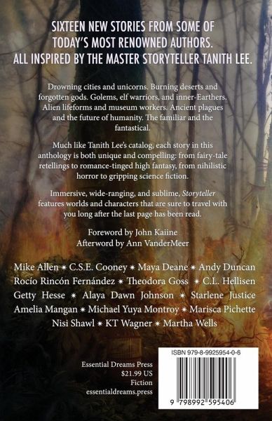Sixteen new stories from some of today's most renowned authors. All inspired by the master storyteller Tanith Lee. Drowning cities and unicorns. Burning deserts and forgotten gods. Golems, elf warriors, and inner-Earthers. Alien lifeforms and museum workers. Ancient plagues and the future of humanity. The familiar and the fantastical. Each story in this anthology is both unique and compelling: from fairy-tale retellings to romance-tinged high fantasy, from nihilistic horror to gripping science fiction. Immersive, wide-ranging, and sublime, Storyteller features worlds and characters that are sure to travel with you long after the last page has been read. Mike Allen, C.S.E. Cooney, Maya Deane, Andy Duncan, Rocío Rincón Fernández , Theodora Goss, CL Hellisen, Getty Hesse, Alaya Dawn Johnson, Starlene Justice, Amelia Mangan, Michael Yuya Montroy, Marisca Pichette, Nisi Shawl, KT Wagner, Martha Wells Foreword by John Kaiine. Afterword by Ann VanderMeer. "...contributors mirror her [Tanith Lee] in literary strength and the ability to spin a compelling, epic story...Each story is emotionally and atmospherically charged...Each pays tribute to the inspiration and gifts of Tanith Lee...[and yet] they are as diverse as Lee's landscapes. Libraries looking for a literary, compelling adjunct to Tanith Lee's writings will find Storyteller a celebration, a tribute, and an important acquisition that nicely compliments Lee's effusive creations. Packed with diversity, supercharged with emotional and philosophical revelation, and full of surprises and power, Storyteller is a special 'must have' acquisition for readers and libraries who have felt the power of Tanith Lee's voice and will be delighted to find it mirrored by her most ardent fellow writers." -Midwest Review of Books "Sixteen authors, including big names like Martha Wells, Andy Duncan, and Nisi Shawl, celebrate the late World Fantasy Lifetime Achievement Award winner Tanith Lee in this passionate and playful anthology of stories inspired by her work...The result is both a fitting tribute to a master and an enchanting compendium in its own right."-Publishers Weekly