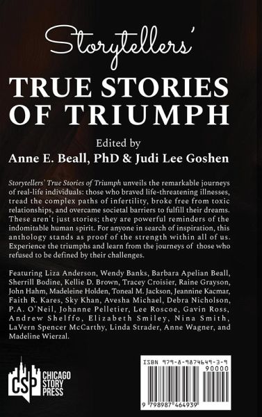 "Storytellers' True Stories of Triumph" unveils the remarkable journeys of real-life individuals: those who braved life-threatening illnesses, tread the complex paths of infertility, broke free from toxic relationships, and overcame societal barriers to fulfill their dreams. These aren't just stories; they are powerful reminders of the indomitable human spirit. For anyone in search of inspiration, this anthology stands as proof of the strength within all of us. Experience the triumphs and learn from the journeys of those who refused to be defined by their challenges. Featuring Liza Anderson, Wendy Banks, Barbara Apelian Beall, Kellie D. Brown, Tracey Croisier, Raine Grayson, John Hahm, Madeleine Holden, Toneal M. Jackson, Jeannine Kacmar, Faith R. Kares, Sky Khan, Avesha Michael, Debra Nicholson, P.A. O'Neil, Johanne Pelletier. Lee Roscoe, Gavin Ross, Andrew Shelffo, Elizabeth Smiley, Nina Smith, LaVern Spencer McCarthy, Linda Strader, Anne Wagner, Madeline Wierzal.