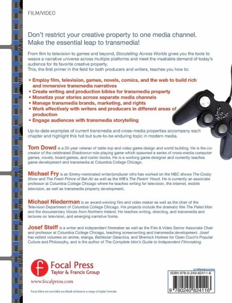 Tom Dowd is a 25-year veteran of paper and video game design and world building. He is the co-creator of the celebrated Shadowrun role-playing game which spawned a series of cross-media computer games, novels, board games, and comic books. He is a working game designer and currently teaches game development and transmedia at Columbia College Chicago. Michael Fry is an Emmy-nominated writer/producer who has worked on the NBC shows The Cosby Show and The Fresh Prince of Bel-Air as well as the WB's The Parent 'Hood. He is currently an associate professor at Columbia College Chicago where he teaches writing for television, the internet, mobile television, as well as transmedia property development. Michael Niederman is an award-winning film and video maker as well as the chair of the Television Department of Columbia College Chicago. His projects include the dramatic film The Paled Man and the documentary Voices from Northern Ireland. He teaches writing, directing, and transmedia and lectures on television, and emerging narrative forms. Josef Steiff is a writer and independent filmmaker as well as the Film & Video Senior Associate Chair and professor at Columbia College Chicago, teaching screenwriting and transmedia development. Joe has edited volumes on anime, manga, Battlestar Galactica, and Sherlock Holmes for Open Court's Popular Culture and Philosophy, and is the author of The Complete Idiot's Guide to Independent Filmmaking.