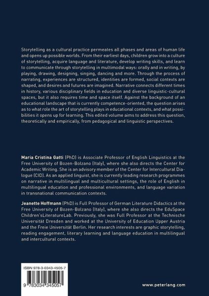 Storytelling as a cultural practice permeates all phases and areas of human life and opens up possible worlds. From their earliest days, children grow into a culture of storytelling, acquire language and literature, develop writing skills, and learn to communicate through storytelling in multimodal ways: orally and in writing, by playing, drawing, designing, singing, dancing and more. Through the process of narrating, experiences are structured, identities are formed, social contexts are shaped, and desires and futures are imagined. Narrative connects different times in history, various disciplinary fields in education and diverse linguistic-cultural spaces, but it also requires time and space itself. Against the background of an educational landscape that is currently competence-oriented, the question arises as to what role the art of storytelling plays in educational contexts, and what possibilities it opens up for learning. This edited volume aims to address this question,theoretically and empirically, from pedagogical and linguistic perspectives.