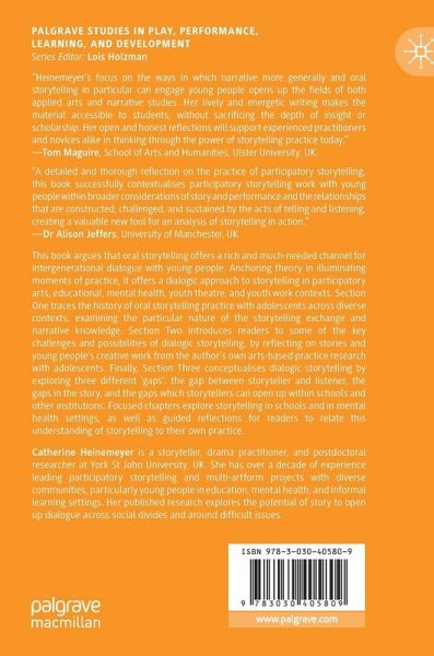 The book keeps theory firmly tethered to practice. Section 1, 'Storyknowing', traces the history of oral storytelling practice with adolescents across diverse contexts, and brings into clear focus the particular nature of the storytelling exchange and narrative knowledge. Section 2, 'Telling Stories', introduces readers to some of the key challenges and possibilities of dialogic storytelling by reflecting on stories from the author's own arts-based practice research with adolescents, illustrating these with young people's artistic responses to stories. Finally, section 3, 'Story Gaps', conceptualises dialogic storytelling by exploring three different 'gaps': the gap between storyteller and listener, the gaps in the story, and the gaps which storytellers can open up within institutions.